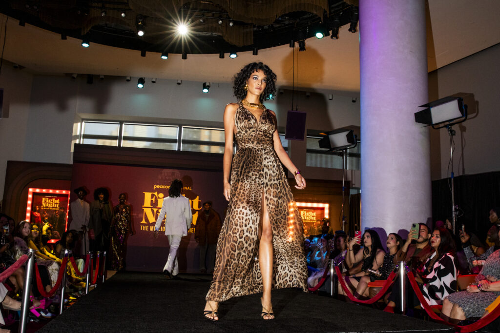 Coinciding with the eve of NY Fashion Week, the red carpet kicked off with a surprise fashion show in partnership with GQ. Drawing inspiration from the series, models showcased high-fashion 70s-inspired looks, blending retro styles with modern sophistication. Adding to the 70s flair, the red carpet featured a replica of Chicken Man’s (played by Kevin Hart) 1966 Cadillac Calais, custom-built by the renowned West Coast Customs.