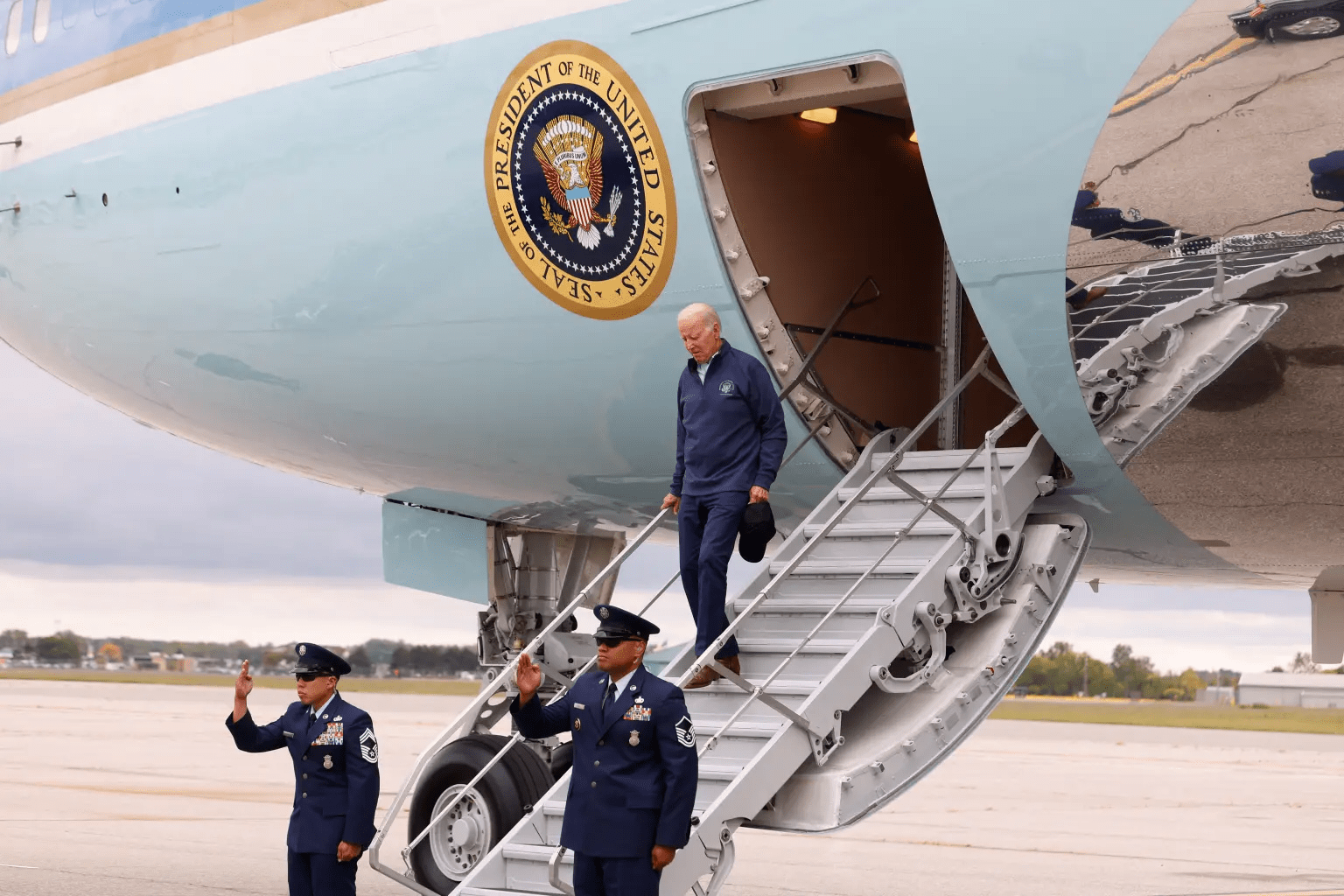 The near-miss occurred moments after Biden touched down at the Detroit Metro Airport, where he was greeted by United Auto Workers president Shawn Fain, Michigan Lt. Gov. Garland Gilchrist and US Reps. Debbie Dingell, Rashida Tlaib and Shri Thanedar, all Michigan Democrats, the clip shared by radio reporter Alex McLennon shows.