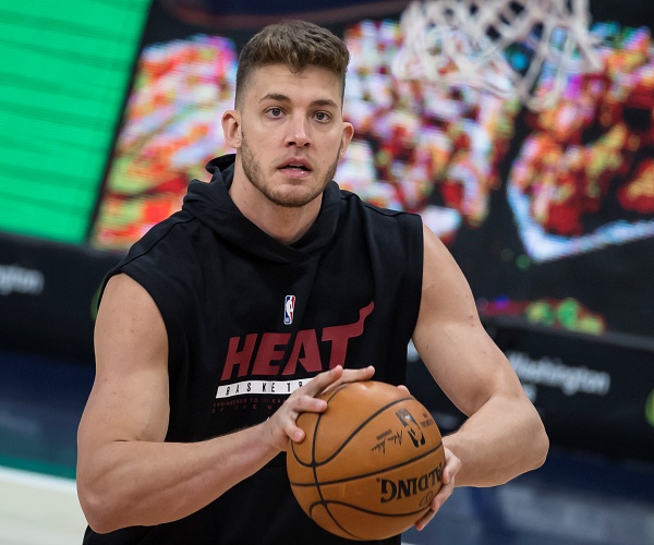 WASHINGTON, DC – JANUARY 09: Meyers Leonard #0 of the Miami Heat warms up before the game against the Washington Wizards at Capital One Arena on January 9, 2021 in Washington, DC. NOTE TO USER: User expressly acknowledges and agrees that, by downloading and or using this photograph, User is consenting to the terms and conditions of the Getty Images License Agreement. (Photo by Scott Taetsch/Getty Images)