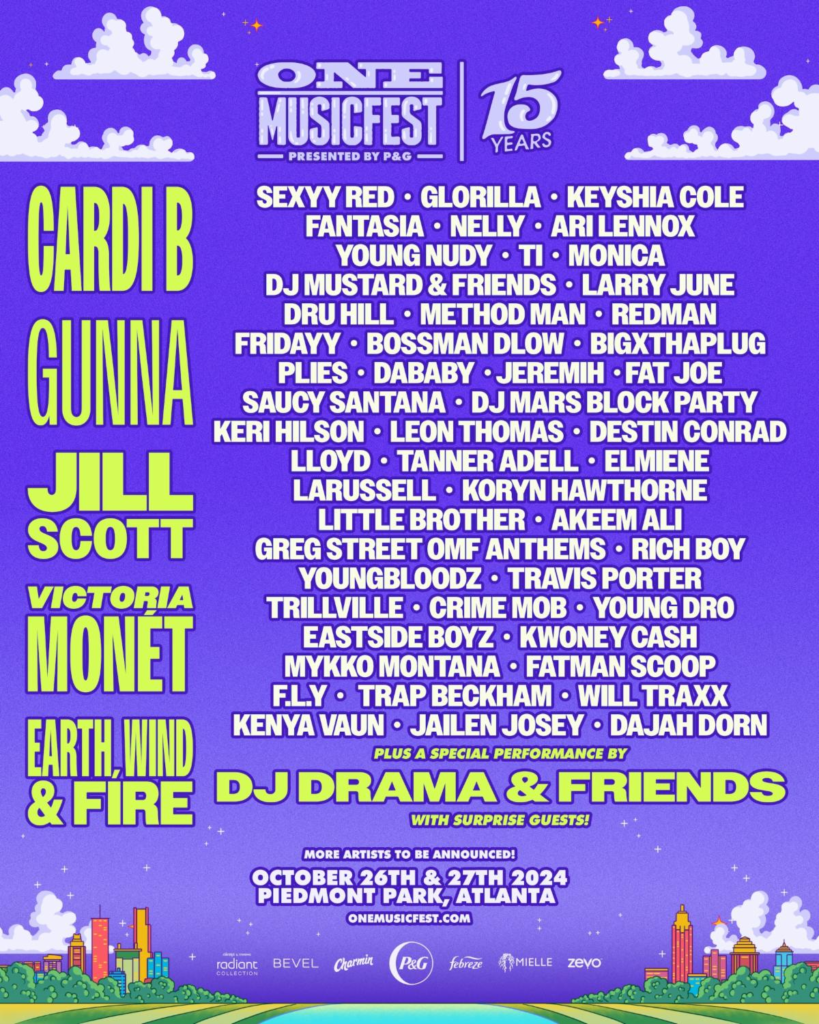 ATLANTA, GA — ONE Musicfest (OMF), presented by Procter & Gamble (P&G), in collaboration with Live Nation Urban (LNU), is excited to announce its eagerly awaited lineup for its 15th anniversary of music, culture, and celebration. The annual two-day festival, founded by Jason “J” Carter, is set for Saturday, October 26th, and Sunday, October 27th, 2024, at Piedmont Park in Atlanta, GA