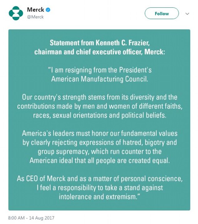 http://www.dailymail.co.uk/news/article-4789118/Merck-CEO-quits-Trump-board-Charlottesville-response.html